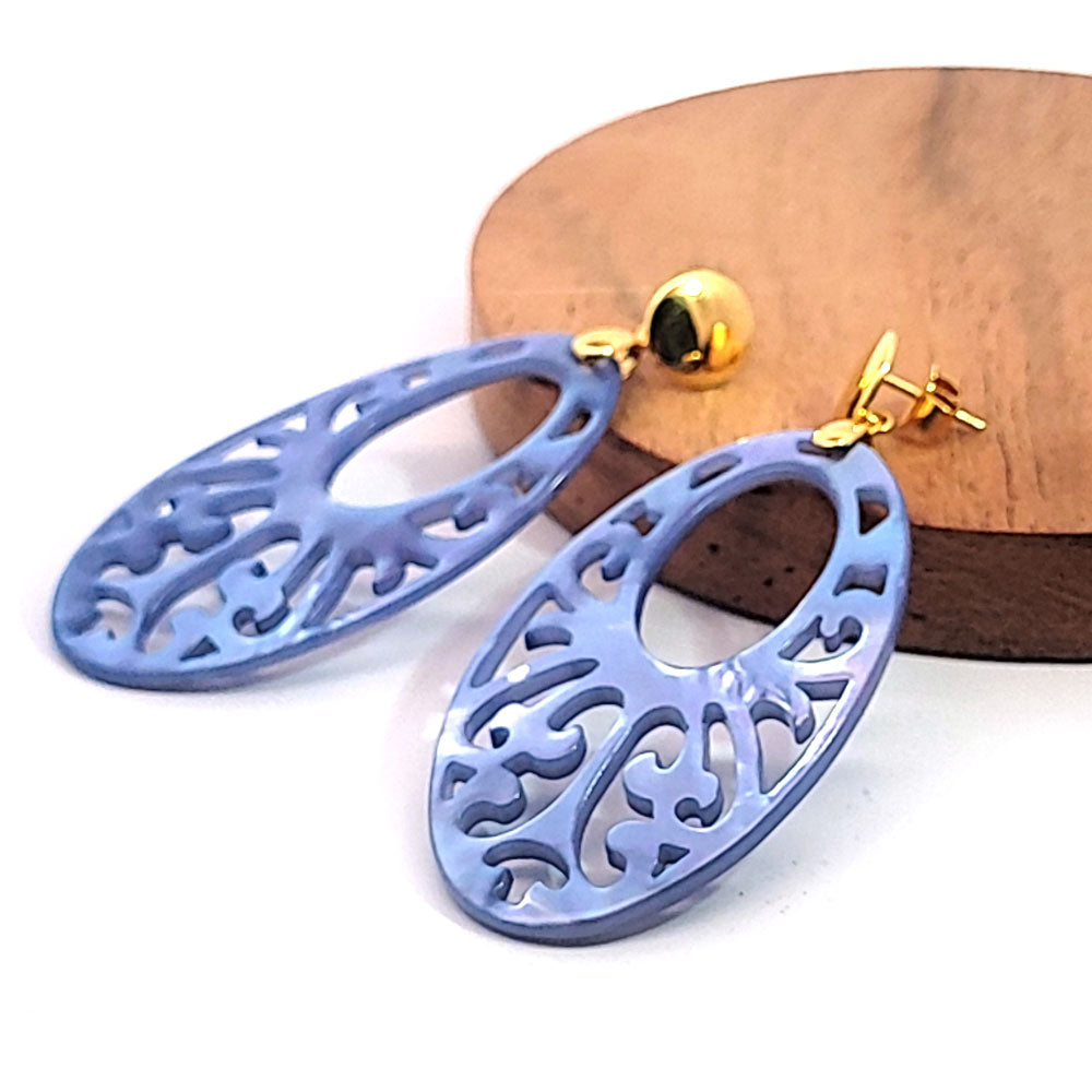 Mother of Pearl Oval Large Blue Dangle Earrings