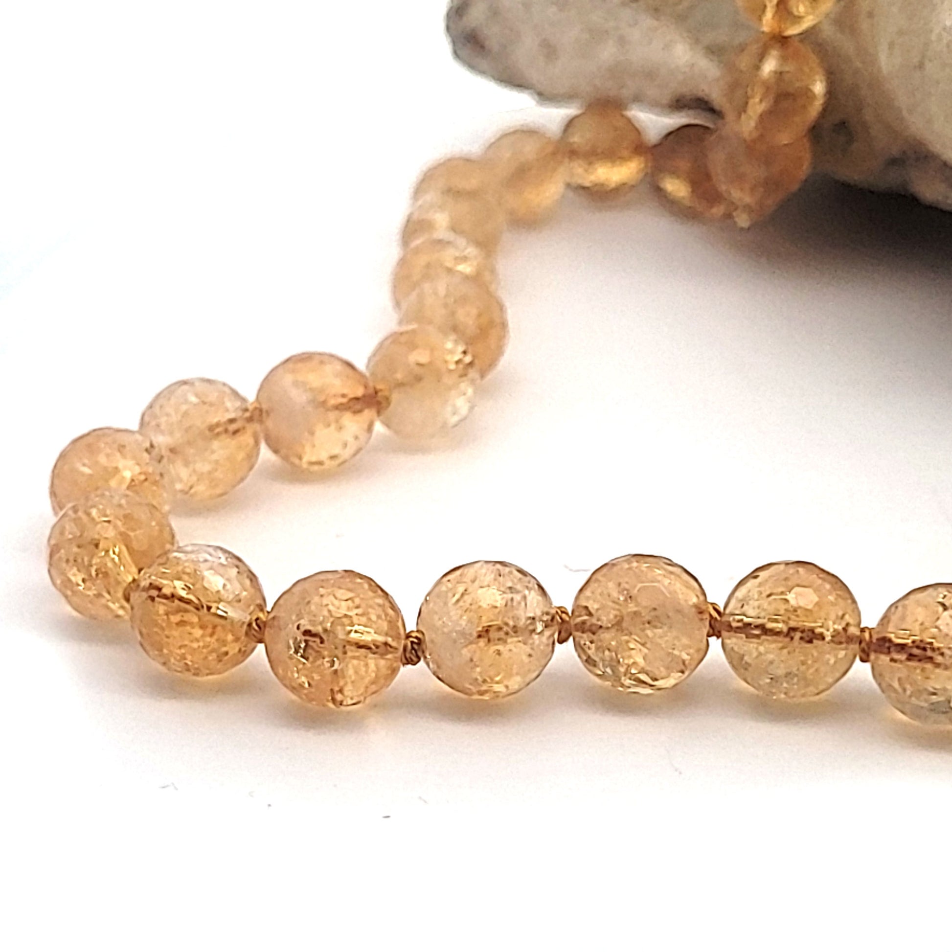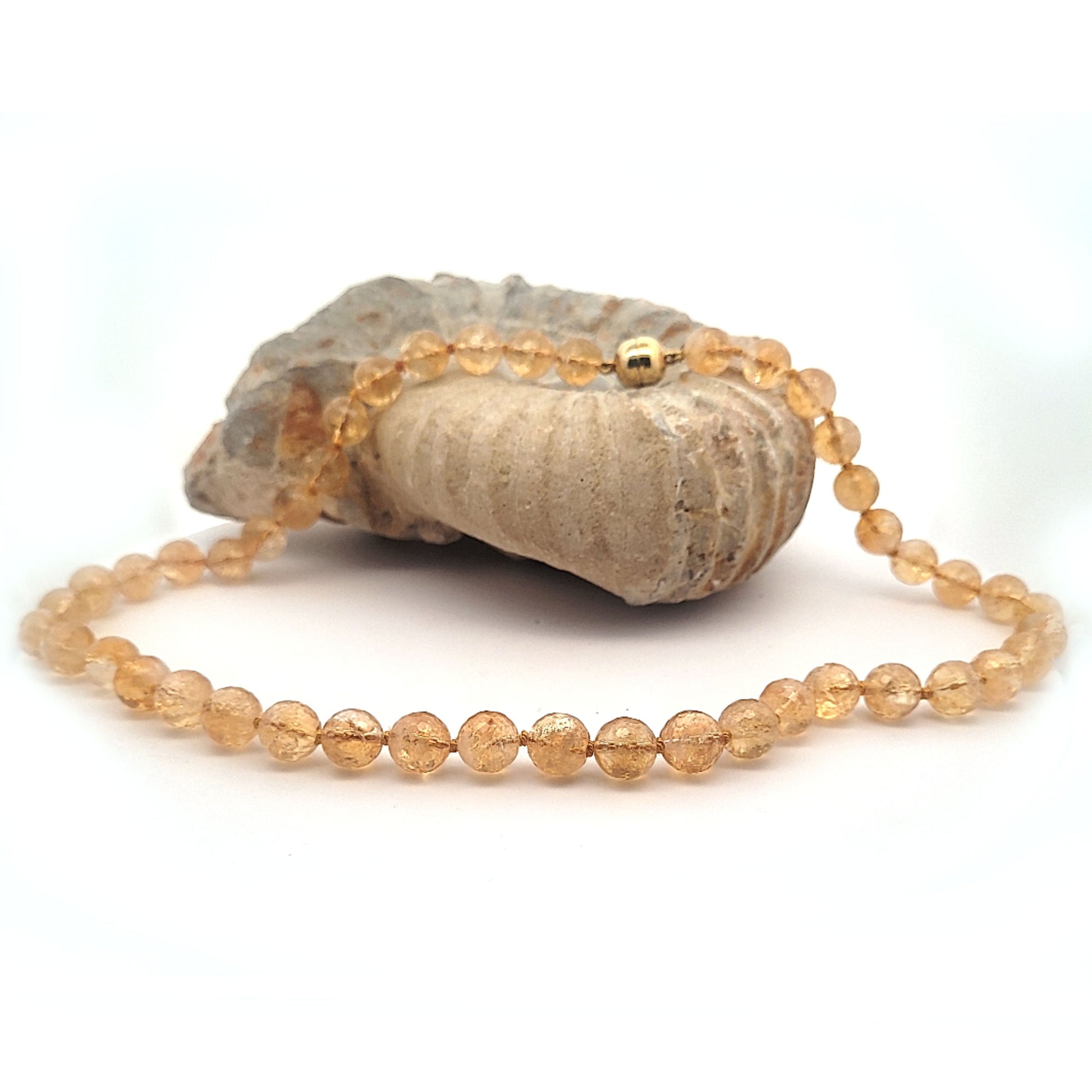 Diese leuchtende Kugelkette aus natürlichem Zitrin besticht durch ihre warme, goldgelbe Farbgebung, die an Sonnenlicht erinnert. Die sorgfältig geschliffenen Kugeln aus hochwertigem Zitrin verleihen dieser Kette eine strahlende, lebendige Ausstrahlung.