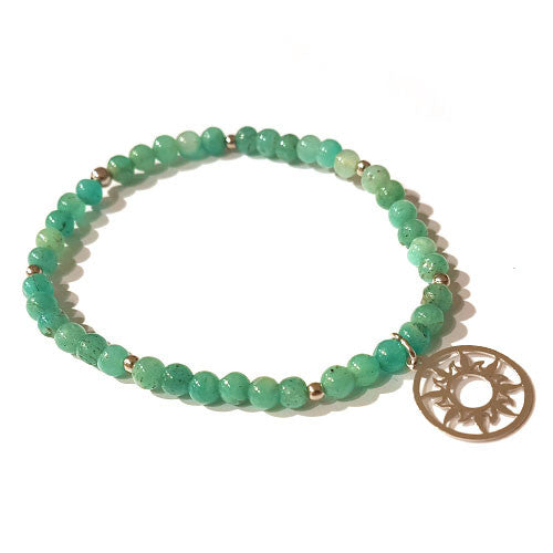 DIeses zarte Armband besteht aus Amazonit und dem Symbol "Sonne des Lebens" in silber rhodiniert.