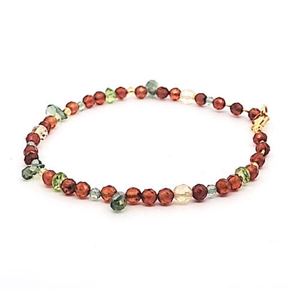 Dieses zarte Armband aus facettierten Granat, Apatit und Zitrin hat eine Länge von ca. 18 cm. Der Karabinerverschluss ist Silber vergoldet.