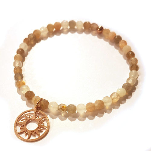 DIeses zarte Armband besteht aus verschiedenfärbigem Mondstein und dem Symbol "Sonne" in silber rosé vergoldet.