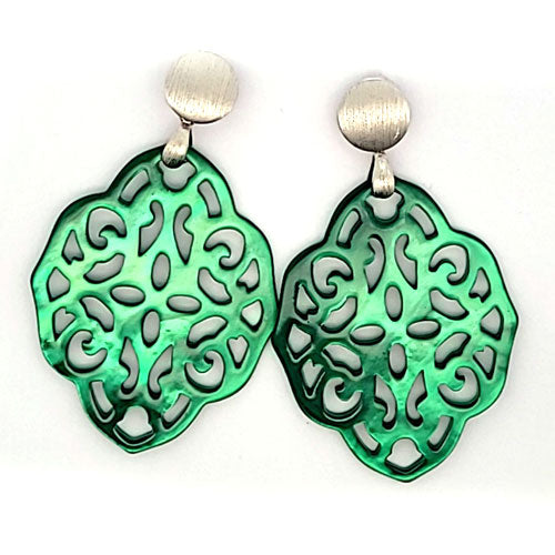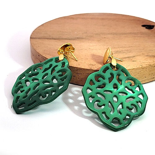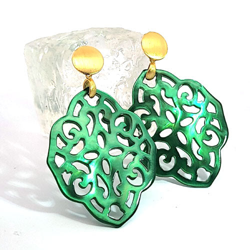 Unsere Ohrringe aus Perlmutt werden teilweise gefärbt. Der Färbe-Prozess wird in einer Firma in Österreich durchgeführt, die darauf spezialisiert ist. Denn das Einfärben von Perlmutt ist ein sehr komplizierter Vorgang, denn bei absoluter Farbechtheit muss das Perlmutt typische Schimmern natürlich erhalten bleiben.