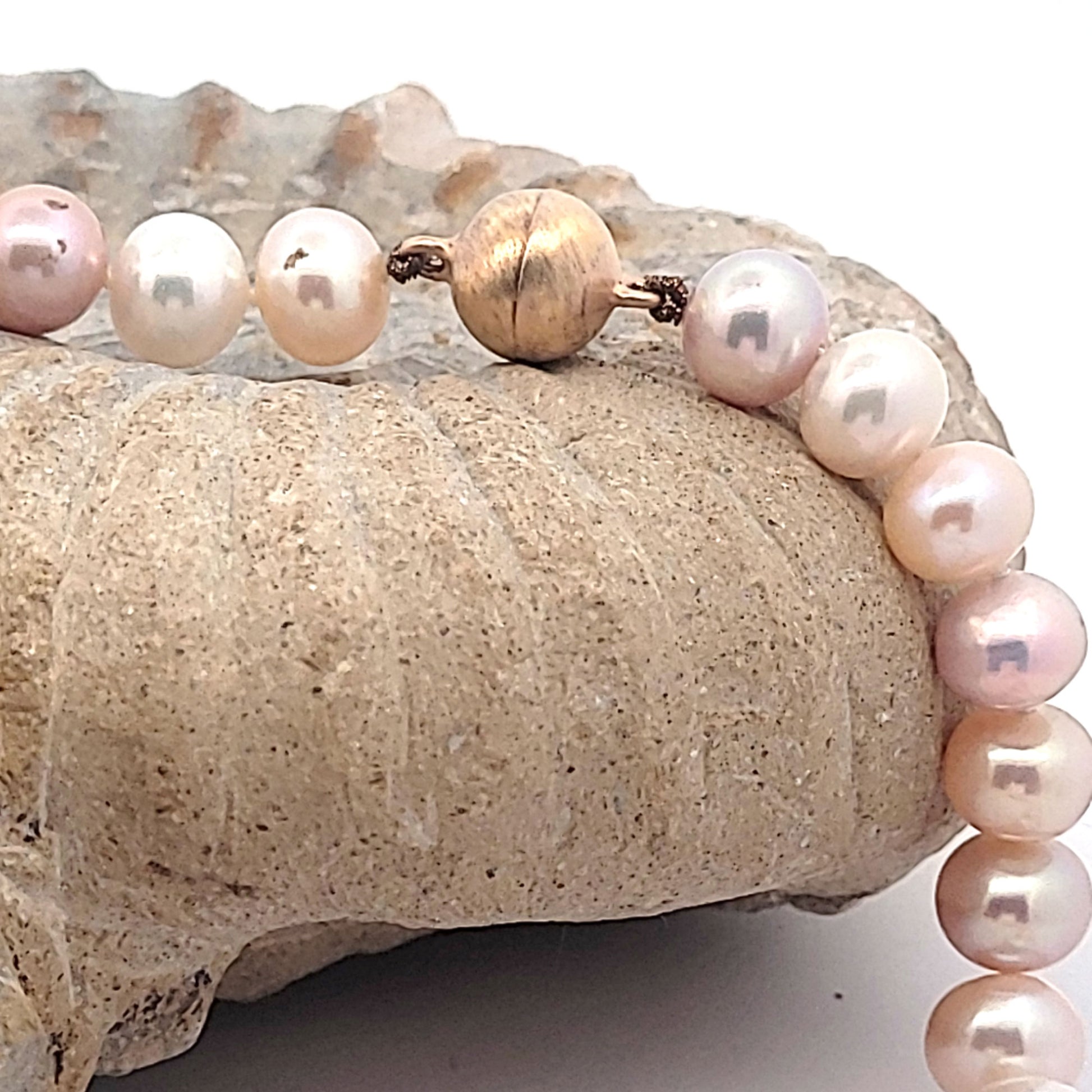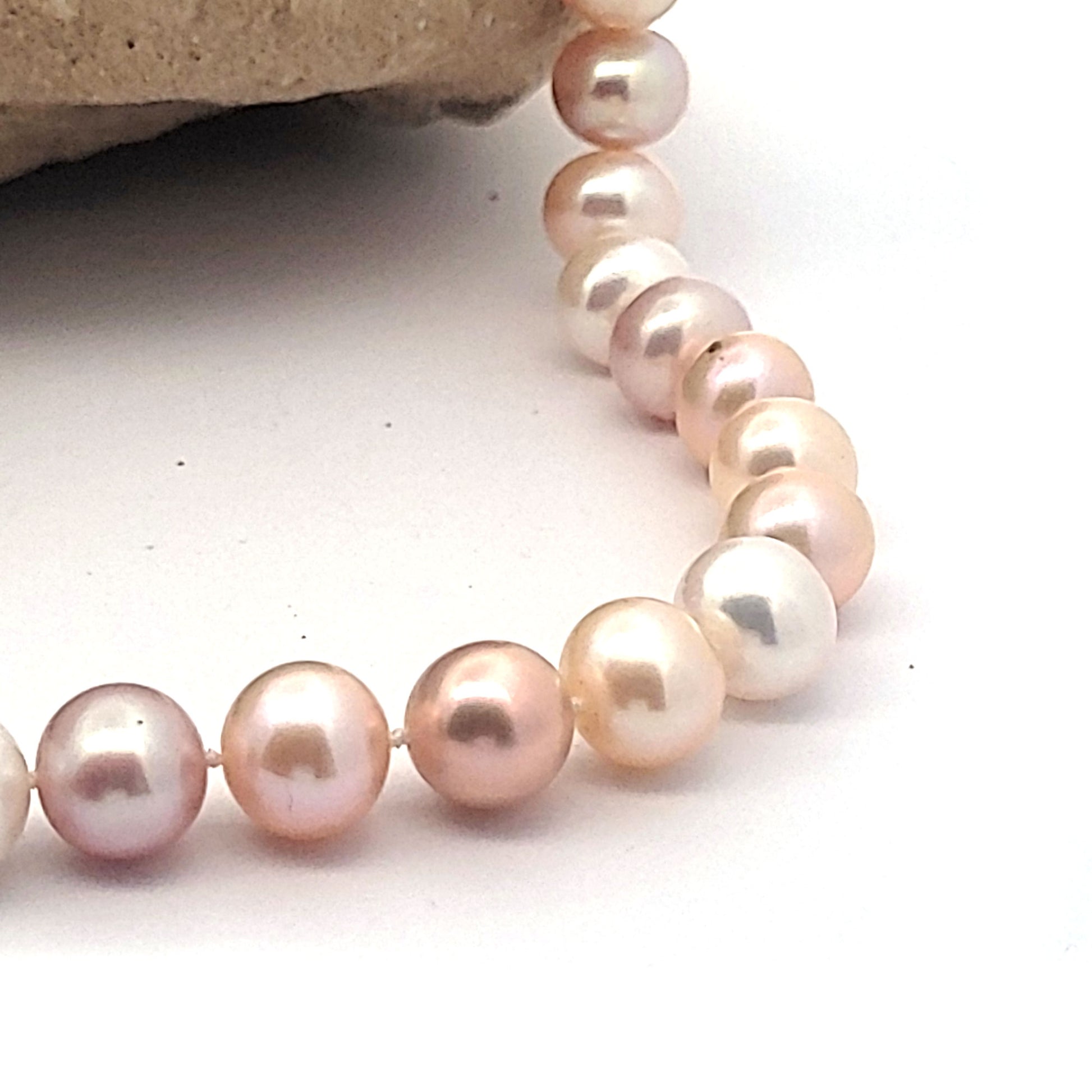 Die natürlichen Farbvariationen entstehen durch unterschiedliche Wachstumsbedingungen der Süßwasserperlen. Jede Perle entwickelt ihre eigene, individuelle Farbnuance – von Weiß über Rosé, Pfirsich bis zu zarten Lavendeltönen. Diese natürliche Vielfalt macht den besonderen Reiz dieser Kette aus.