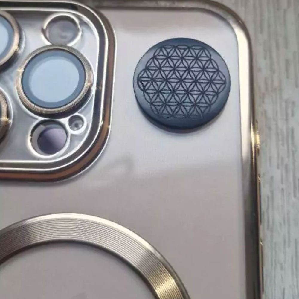 Diese runde Schungitplatte „Blume des Lebens“ fürs Handy ist eine außergewöhnliche Schönheit: Sie ist besonders flach und hat einen Durchmesser von ca. 2,2 cm sowie eine Höhe von ca. 2 mm. Das Handyaccessoire aus Naturstein lässt sich selbstklebend ganz einfach auf der Rückseite von Smartphones befestigen. Hier bietet die Platte mit ihrer ganzheitlichen Form einen stilvollen Hingucker, der durch seine minimalistische Eleganz besticht. Die runde Schungitplatte „Blume des Lebens“ fürs Handy wird im Volksglauben als Talisman genutzt, der vor negativen Energien schützt. Vielfach wird der Stein als Schutz gegen negative Strahlen eingesetzt. Dabei schirmt er die elektrischen Strahlen beim Handy nicht ab, sondern minimiert ihren negativen Einfluss auf lebende Organismen. Ob Shungit gegen 5G Strahlen sicher schützen kann, wird gerade erforscht. Als Plättchen auf dem Handy soll der Stein zu besserer Verträglichkeit der Mobilfunk-Strahlen beitragen.